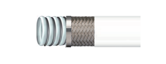 波纹PTFE管(PTFE无缝挤出工艺),拥有阻燃性,低渗透性,耐疲劳和耐化学品等多种特性的工业软管。加装螺旋钢丝,可有效防止软管在极度弯曲时的变形,提升频繁弯曲时承受负压的能力。不锈钢编织网可有效提升工作压力,外层硅胶有效保护软管,保持外层洁净,易于操作。