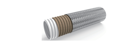 波纹PTFE管(PTFE无缝挤出工艺),拥有阻燃性,低渗透性,耐疲劳和耐化学品等多种特性的工业软管。低波螺旋设计更易于排水,弯曲半径更小,降低真空阻力。阻燃玻纤布粘合在PTFE外壁,保护PTFE不易损坏。外层钢丝网增加了软管承压能力。